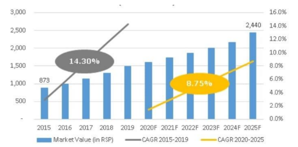 Seed market value in India. Note: RSP= Retail Selling Price (Source: https://www.wm-strategy.com/news/india-nuts-and-seeds-market-to-grow-at-cagr-of-8-75-until-2025)