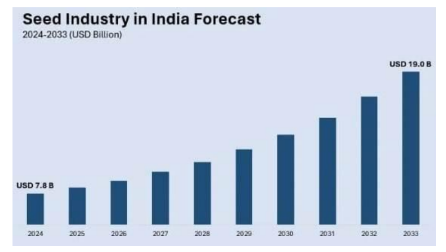The size of the seed industry in India reached USD 7.8 Billion in 2024 and the market is projected to reach USD 19.0 Billion by 2023, exhibiting a growth rate (CAGR) of 10.5% during 2025-2033 (Source:https://www.imarcgroup.com/seed-industry-in-india).